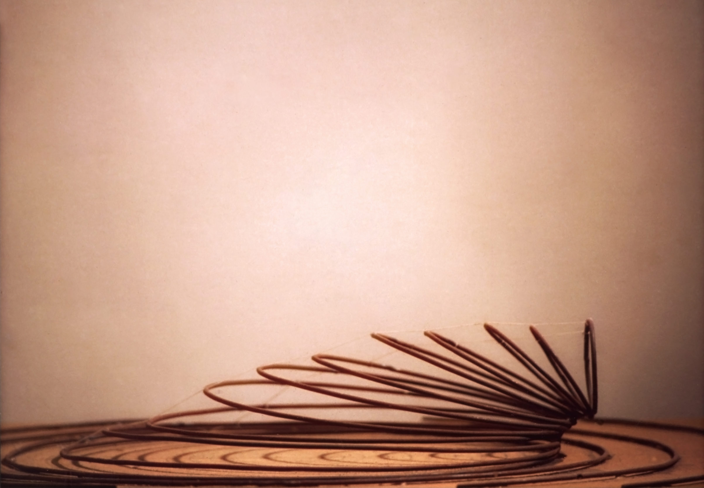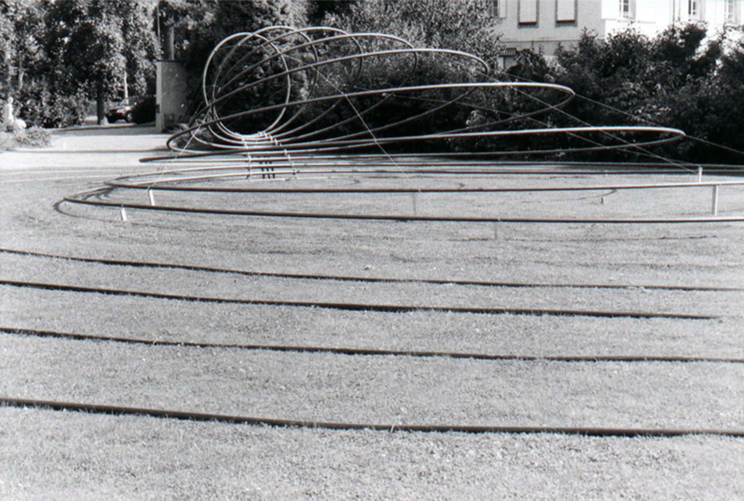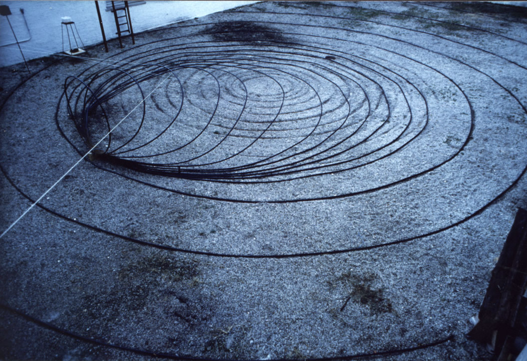 À la façon des ondes aquatiques qui se créent après qu’on a lancé une pierre dans une étendue d’eau, l’installation Rising Rings met en scène un jeu de cercles concentriques. Une quinzaine d’anneaux de diamètres croissants passent de la position verticale à la position horizontale. Le premier anneau, le plus petit (diam 180cm), est posé verticalement et symbolise le champ de la perception humaine. Perpendiculaire à lui, couché au sol, se trouve l’anneau le plus grand (diam env 15m) qui symbolise, lui, l’entrée vers les étendues infinies de l’espace. Entre eux s’articule une série d’anneaux qui s’inclinent progressivement en augmentant leur diamètre pour figer une visualisation de cette progression. L’installation poursuit au sol l’élan donné par ce premier élément couché via une série d’anneaux successifs toujours plus grands, suggérant un élargissement infini.