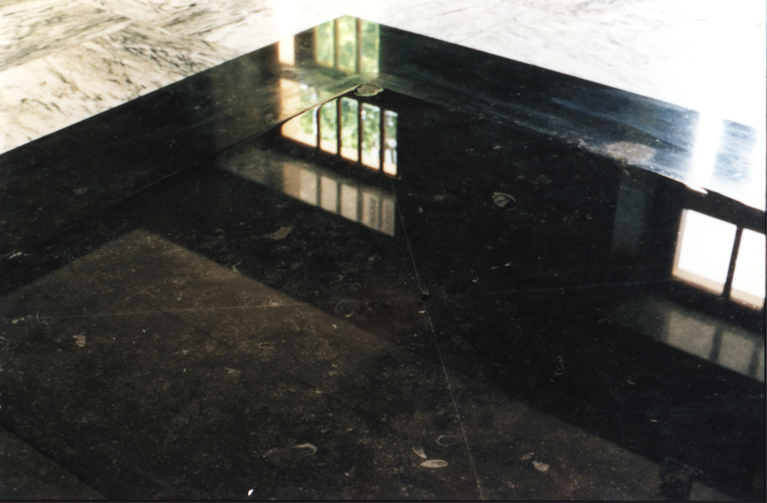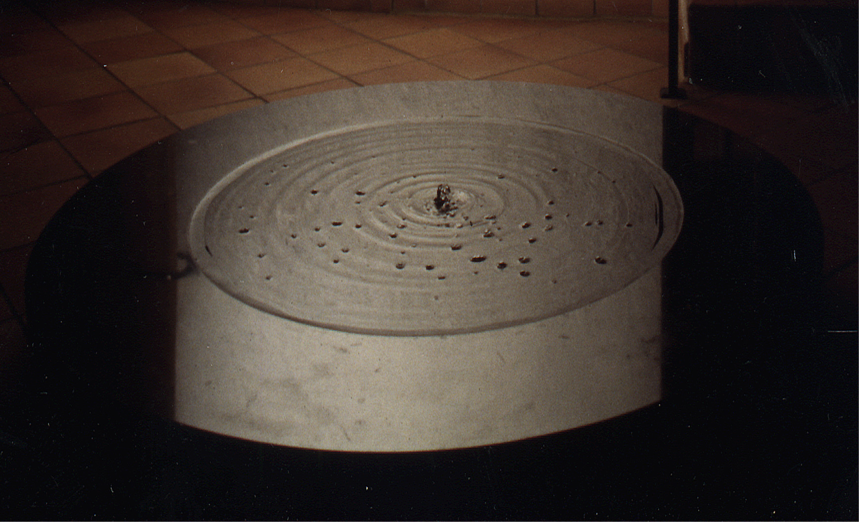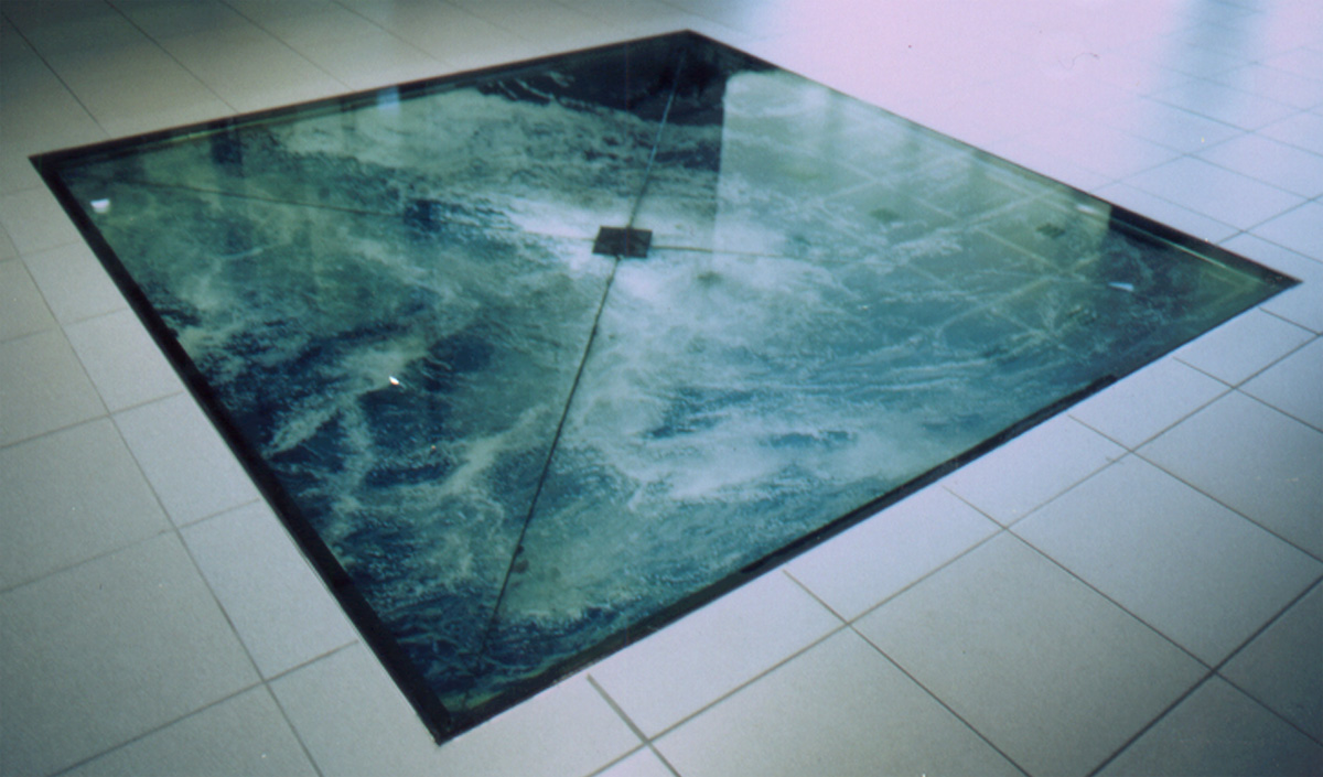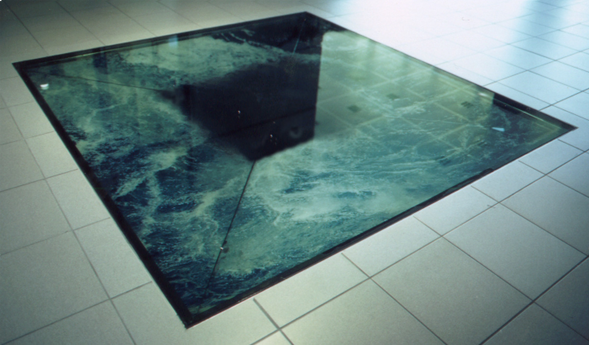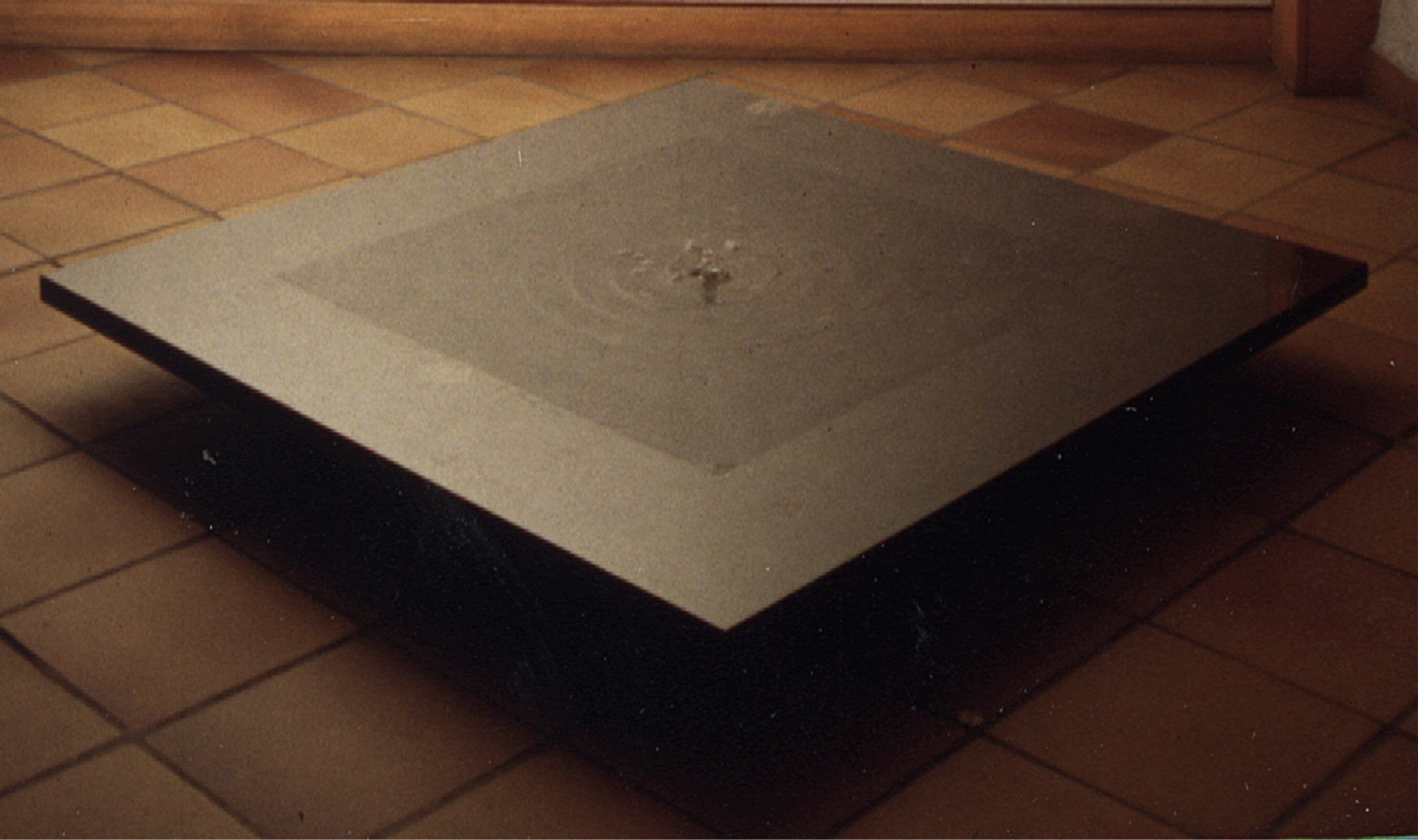 Souffle d’eau est une installation plusieurs fois produite, qui met en scène des petits plans d’eau carrés très légèrement creusés, soit sur des plaques en pierre, soit directement au sol. Ces installations se déguisent en fontaines et animent un jeu d’eau qui imite une respiration. La surface d’eau est alternativement aspirée et recrachée, vidant et remplissant la vasque. Cette vasque, toujours carrée, est creusée en une légère pointe de diamant inversé (cône carré posé sur la pointe). Forçant l’eau à s’écouler en suivant ces pans plats, ce petit bassin se vide par un écoulement perforé au fond, au centre de la pointe de diamant. À chaque aspiration (inspiration), l’eau disparaît de la vasque pour être récoltée dans un bac enterré et invisible. Et à chaque remplissage (expiration) l’eau réapparaît en remplissant la vasque dans un nouveau cycle. Cependant, forcées de suivre les plans carrés des parois, les ondes circulaires naturellement créées par le mouvement de l’eau, en rebondissant contre ces pans plats, se transforment, elles également, en carrés. Cette transformation du jeu d’ondes rondes et ondes carrées et concentriques installe une dimension absurde, ou peu magique, qui permet à l’œuvre de décoller du pragmatisme de la matière. L’effet visuel un peu envoûtant, conforté par la symbolique de l’alternance du passage du rond au carré, invite à la réflexion ou à la méditation, alors que l’allusion à la respiration attribue à l’eau une qualité typique des organismes vivants. Cet exercice de quadrature du cercle rappelle aussi notre lien ancestral à la soupe primaire et créatrice dont nous venons. Dans la version commandée par les SIG, l’eau, cette source vitale et non renouvelable, est teintée d’une encre noire, alors que les plans de la vasque sont, eux, revêtus de l’image d’une eau limpide. Cette version plus engagée, rappelle la fragilité de cet élément et la responsabilité que nous avons, en tant qu’espèce endémique, face à l’environnement en général.
