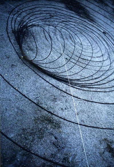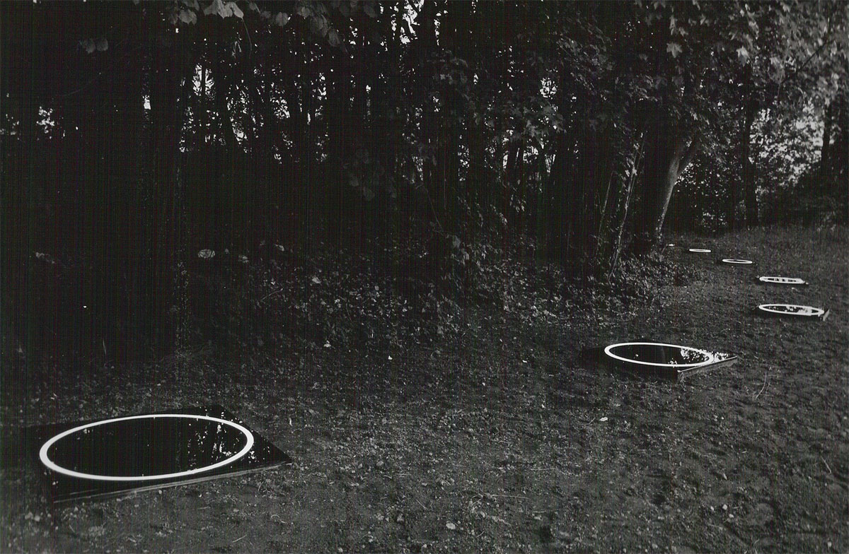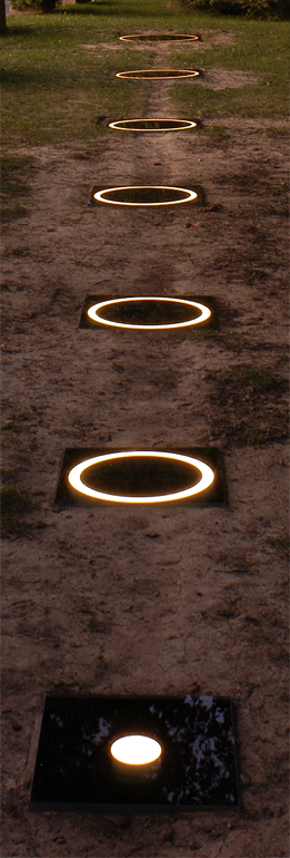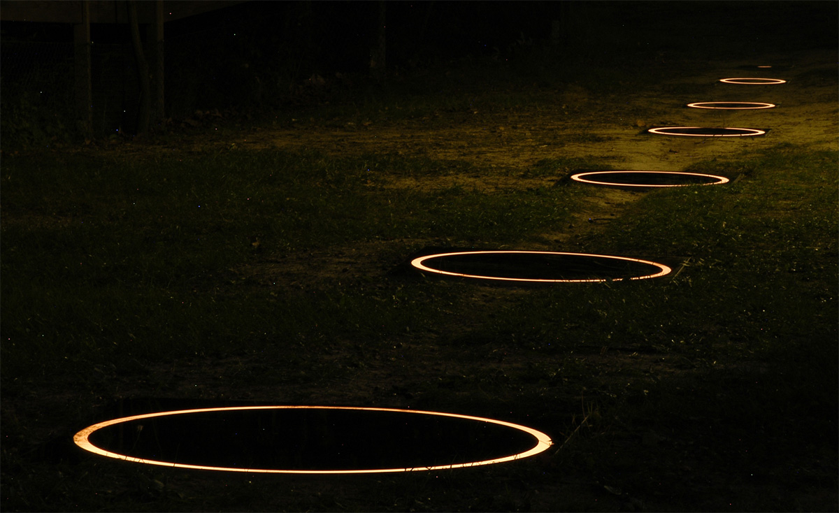 Les ricochets, jeu qui fascine l’artiste depuis son enfance, sont une inspiration qui sert ce thème en éphémère et infini. L’installation Rings reprend le principe du ricochet, mais efface le galet pour ne retenir, par un jeu de lumière, que la succession d’ondes . Une série de caissons successifs et décroissants sont enterrés et couverts d’une vitre sans teint qui affleurent le gazon. Chaque caisson renferme un jeu de lumière qui laisse apparaitre en surface un anneau de lumière. Une minuterie règle l’apparition éphémère de ces cercles lumineux, les allumant et les éteignant, en alternance, du plus grand au plus petit, reproduisant ainsi la course du galet qui rebondit sur l’eau. C’en est la trace fugace et dématérialisée qui est mise en scène par cette installation.